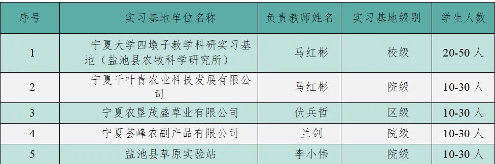 学院有草业科学、林学、林学专业(枸杞方向)和园林4个本科专业(专业方向)。其中,林学和草业科学(专业)起始于1958年,园林专业起始于1995年。草业科学专业为首批国家一流建设专业、国家特色专业和自治区优势特色专业,林学专业为传统特色骨干专业。草业科学为国家重点学科,草学为宁夏重点学科(优势特色学科)和自治区“双一流”重点建设学科,林学学科为传统骨干特色学科。建有草学一级博士、硕士授权点,在农艺与种业领域设有草业专业硕士;林学学科设有林业专业硕士学位授权点,建有草学博士后流动站。