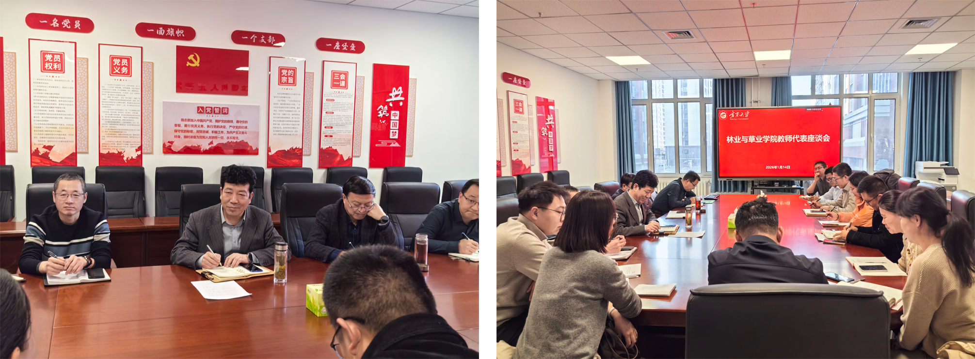 为广泛听取一线教师对学院管理服务及班子建设等方面的意见建议,进一步凝聚发展共识,2026年1月14日,学院在新农科大楼248研讨室召开教师代表座谈会,学院党总支书记贺海明主持座谈会。院长马红彬、副院长伏兵哲以及林学和草业科学系的12位教师代表齐聚一堂,围绕学院发展规划、制度完善、资源分配、管理服务等核心议题展开深入交流,现场讨论热烈。