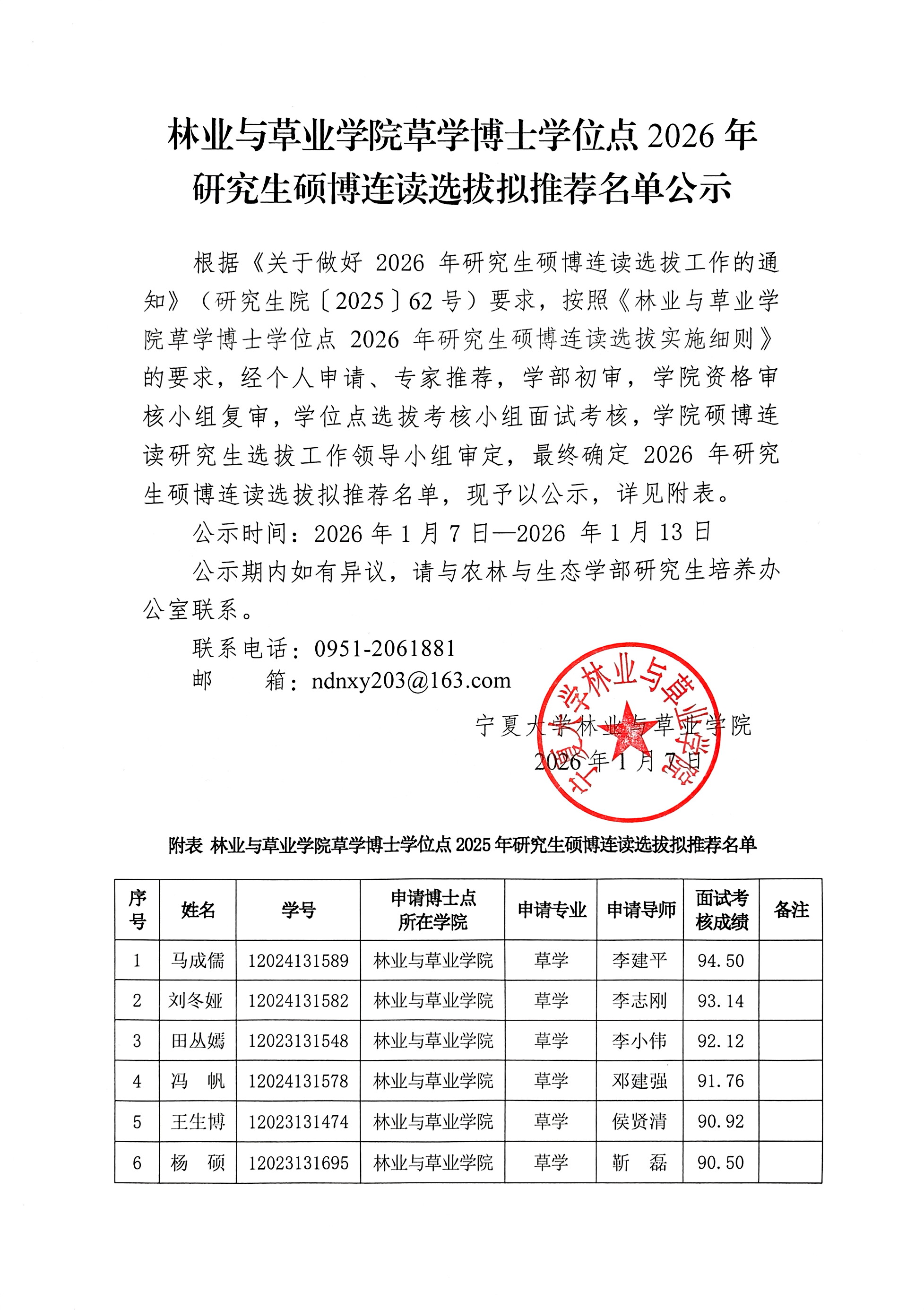 一帆视频 草学博士学位点2026年研究生硕博连读选拔拟推荐名单公示